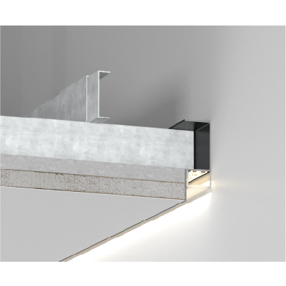 Wall edge aluminum channel for single and double-layer gypsum ceilings.Made from high-quality anodized aluminum profiles, this product offers high strength, lightweight construction, corrosion resistance, and excellent thermal dissipation. By incorporating aprecisely designed gap, it creates asoft shadow effect, enhancing the visual perception of afloating and weightless ceiling.When paired with LED light strips, it delivers uniform wall-washing illumination without glare or hotspots, serving both edge finishing and optical control functions. Applied to modern minimalist ceilings, indirect lighting systems, and commercial space lighting.
