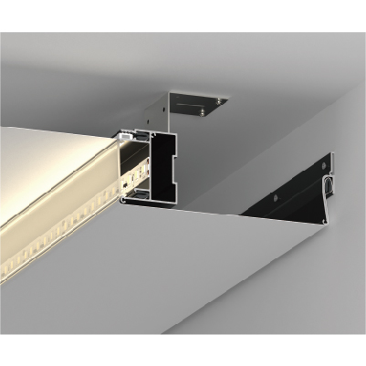 Stretch ceiling connection aluminum channel. Constructed from premium anodized aluminum profiles, it offers high strength, lightweight properties, corrosion resistance, and excellent heat dissipation. The unique structural design connects flexible stretch film at both ends. By combining various flex profile, it enables infinite possibilities from simple planes to complex curved surfaces. It provides uniform tension to keep the flexible membrane flat and taut. Beyond merely integrating with the space, it creates a comfortable, sophisticated, and expressive visual environment. Primarily used in studios, brand boutiques, offices, and similar settings.