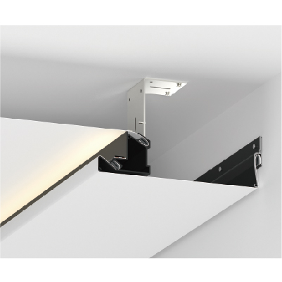 Stretch ceiling connection aluminum channel. Constructed from premium anodized aluminum profiles, it offers high strength, lightweight properties, corrosion resistance, and excellent heat dissipation. The unique structural design connects flexible stretch film at both ends. By combining various flex profile, it enables infinite possibilities from simple planes to complex curved surfaces. It provides uniform tension to keep the flexible membrane flat and taut. Beyond merely integrating with the space, it creates a comfortable, sophisticated, and expressive visual environment. Primarily used in studios, brand boutiques, offices, and similar settings.