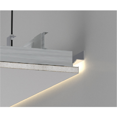 Wall edge aluminum channel for single and double-layer gypsum ceilings.Made from high-quality anodized aluminum profiles, this product offers high strength, lightweight construction, corrosion resistance, and excellent thermal dissipation. By incorporating aprecisely designed gap, it creates asoft shadow effect, enhancing the visual perception of afloating and weightless ceiling.When paired with LED light strips, it delivers uniform wall-washing illumination without glare or hotspots, serving both edge finishing and optical control functions. Applied to modern minimalist ceilings, indirect lighting systems, and commercial space lighting.